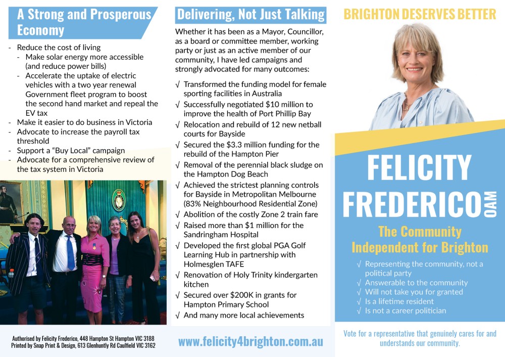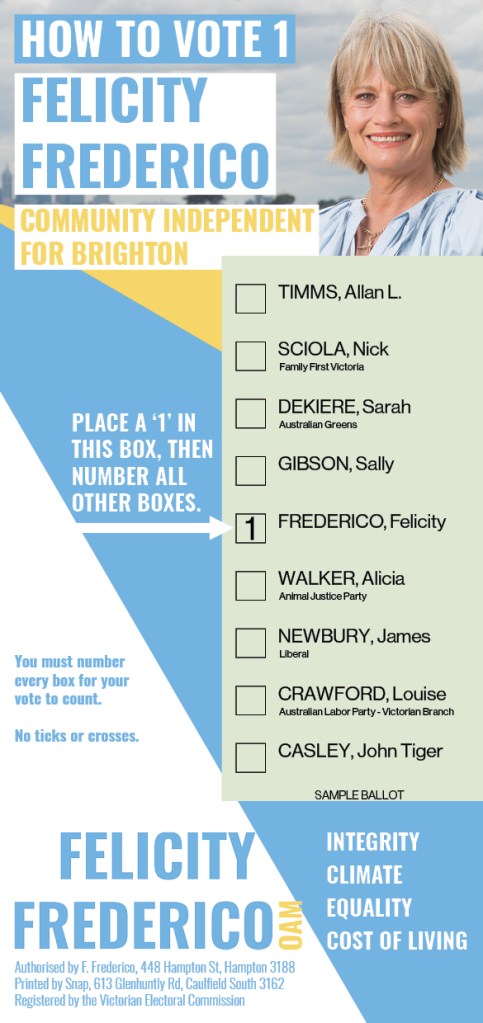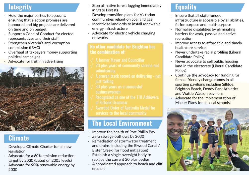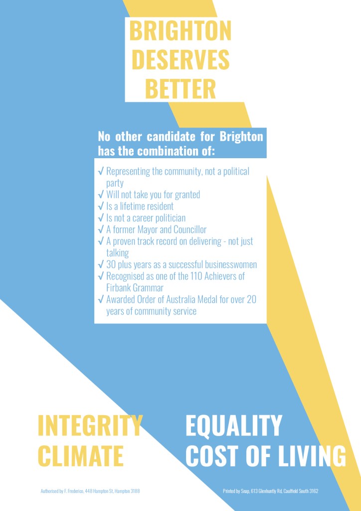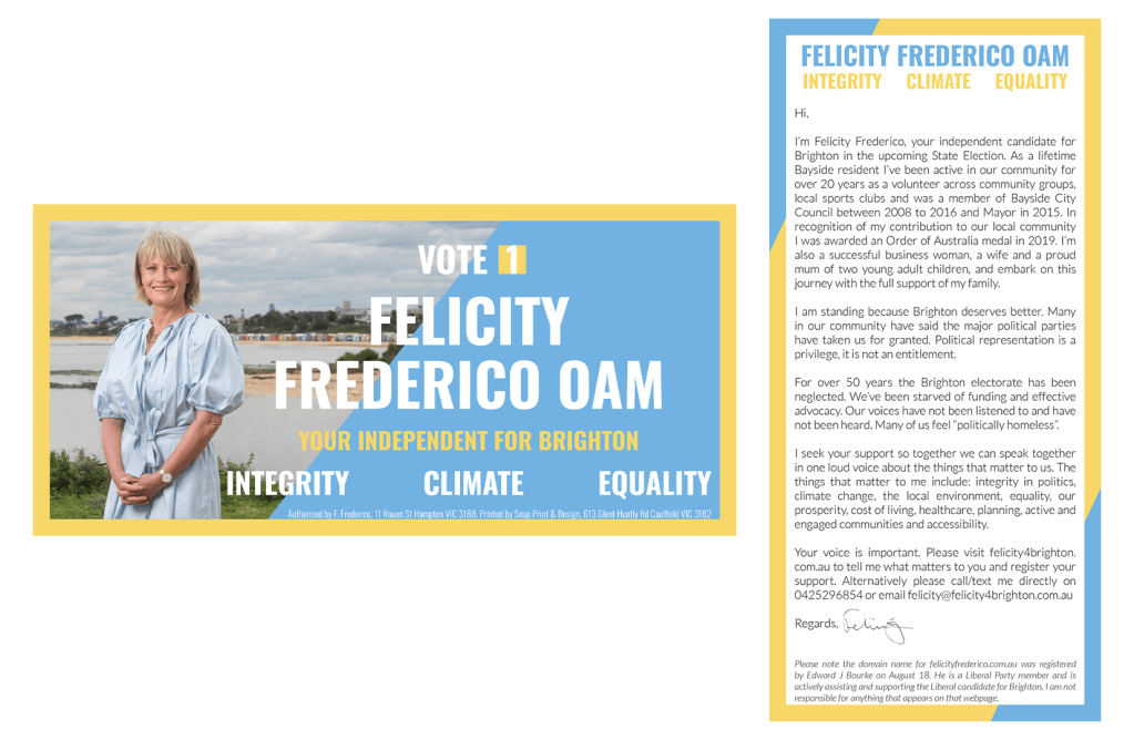 After the success of ‘Teal’ independent candidates in the 2022 federal election there was thought to be room for independents in the subsequent state election in Victoria. Being within the now independent federal electorate of Goldstein a small but driven group of the community sought to present the idea of an independent candidate for the state electorate of Brighton. I joined this group months out from the election as the sole design professional, and began what would be the most challenging chapter in my career so far.