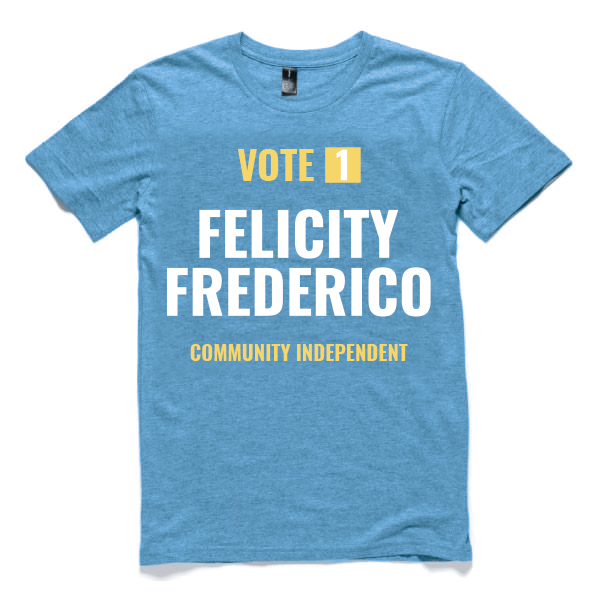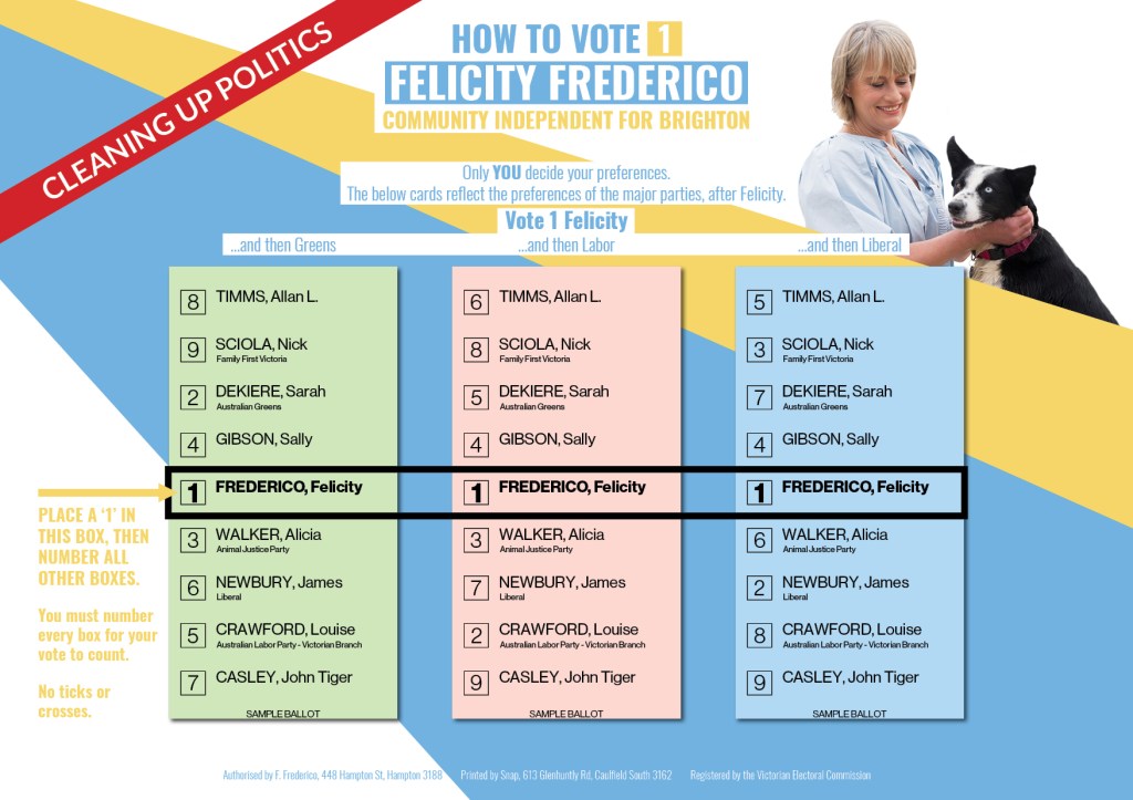 The third How to Vote card we submitted was an A4 sheet displaying the voting preferences of the Greens, Labor, and Liberal parties (left to right), albeit with Felicity replacing the first preference for each. This was due to a contest over the VEC’s guidelines which seemed to be interpreted differently depending on who you spoke to (more on that here). In the end our initial designs would’ve been allowed after better funded independent campaigns took the VEC to court and had the guidelines relaxed… after we’d received our print run of the above A4 HTVs.